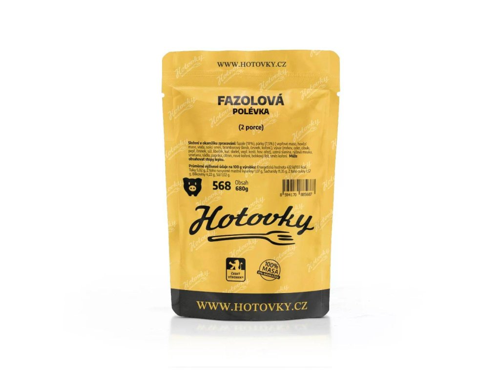 Fazole (18%), párky (7,5%) ( vepřové maso, hovězí maso, voda, solící směs, bramborový škrob, česnek, koření.), vývar (mrkev, celer, cibule, pepř, česnek, sůl, libeček, kuř. skelet, vepř. kosti, hov. ořez), uzená slanina, rýžová mouka, smetana, sádlo, paprika, citron, nové koření, bobkový list, směs koření. Může obsahovat stopy lepku.