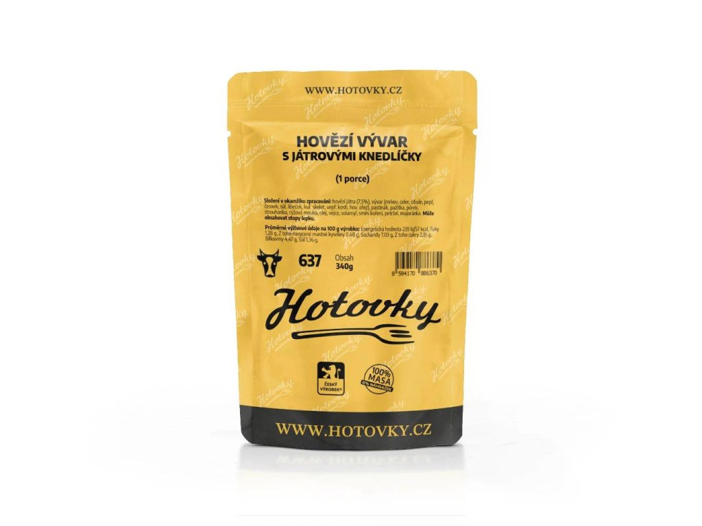 Hovězí játra (7,5%), vývar (mrkev, celer, cibule, pepř, česnek, sůl, libeček, kuř. skelet, vepř. kosti, hov. ořez), pastinák, pažitka, pórek, strouhanka, rýžová mouka, olej, vejce, solamyl, směs koření, petržel, majoránka. Může obsahovat stopy lepku.