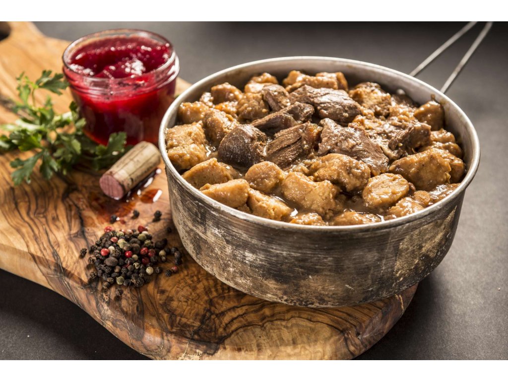 jelení maso (30 %), bramborové špalíčky (28 %) (voda, bramborové vločky (SO2) (40 %), pšeničná mouka, pšeničná krupice, sůl), kořenová zelenina (mrkev, celer, petržel), cibule, červené víno (obsahuje SO2), řepkový olej, rajčatový protlak, rýžová mouka, kukuřičná mouka, rybízová marmeláda (rybíz, cukr, pektin), cukr, citronová šťáva, sůl, pepř, nové koření, skořice, bobkový list.