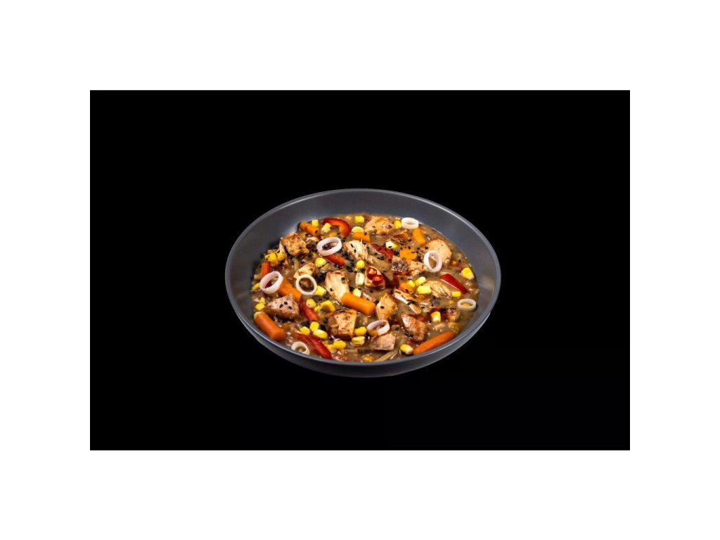 Krůtí maso nakrájené na nudličky, v pikantní sojovoústřicové omáčce s žampiony, kapii, kukuřicí, pórkem a bambusovými výhonky dochucené rajským protlakem.