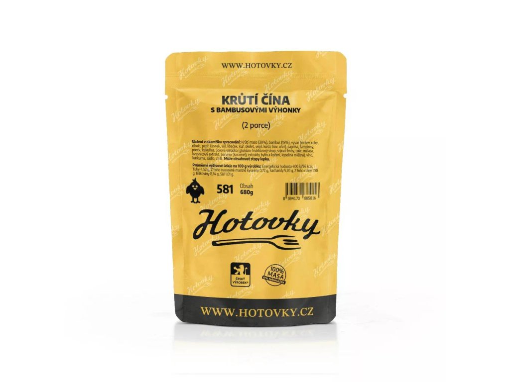 Krůtí maso (30%), bambus (18%), vývar (mrkev, celer, cibule, pepř, česnek, sůl, libeček, kuř. skelet, vepř. kosti, hov. ořez), paprika, žampiony, pórek, kukuřice, Sojová omáčka (glukózo-fruktózový sirup, sojové boby, cukr, melasa, kvasnicový extrakt, barvivo (karamel), extrakty bylin a koření, kyselina mléčná), víno, kurkuma, sádlo, chilli. Může obsahovat stopy lepku.