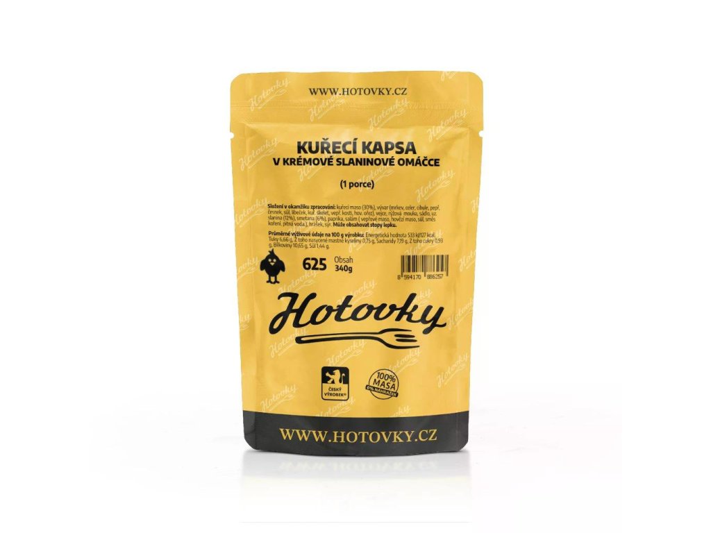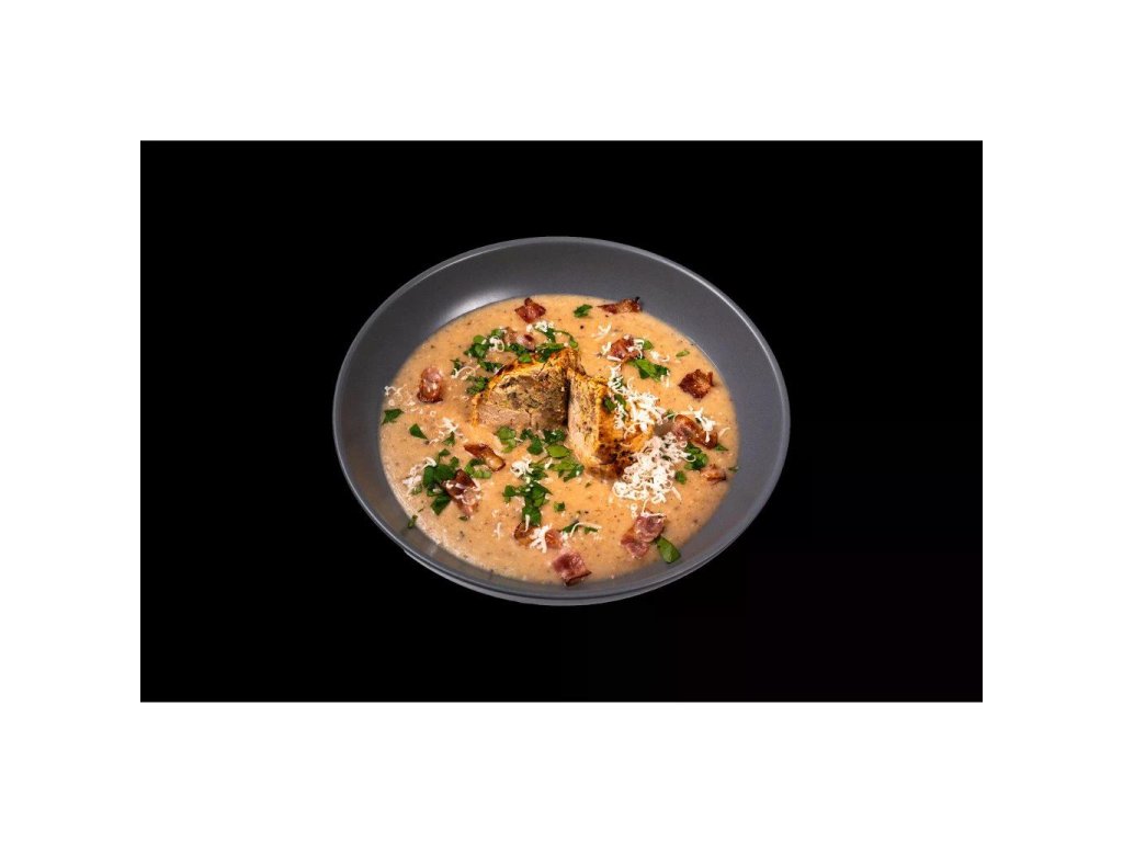Kuřecí maso (30%), vývar (mrkev, celer, cibule, pepř, česnek, sůl, libeček, kuř. skelet, vepř. kosti, hov. ořez), vejce, rýžová mouka, sádlo, uz. slanina (12%), smetana (6%), paprika, salám ( vepřové maso, hovězí maso, sůl, směs koření, pitná voda.), hrášek, sýr. Může obsahovat stopy lepku.