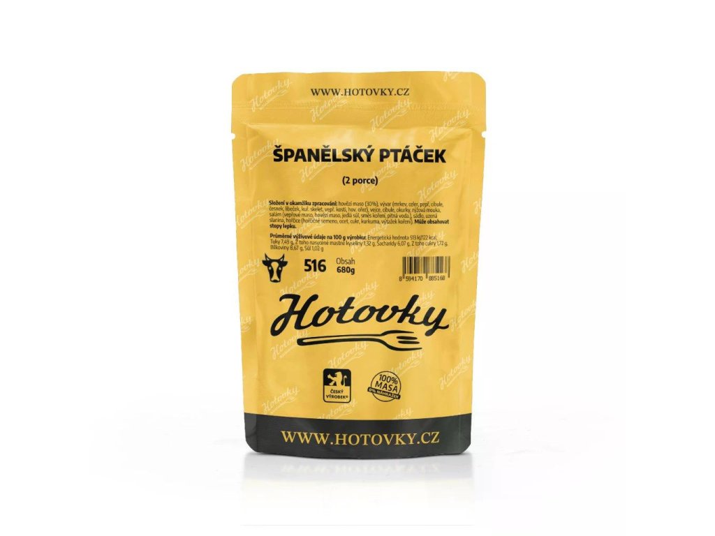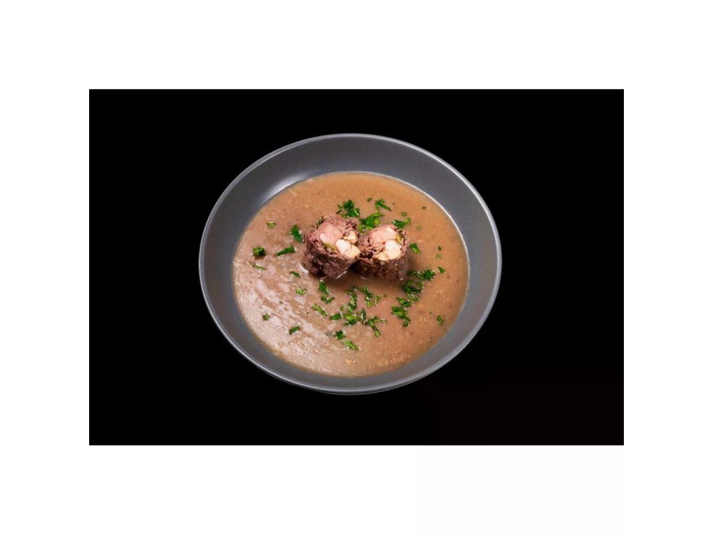 hovězí maso (30%), vývar (mrkev, celer, pepř, česnek, libeček, kuř. skelet, vepř. kosti, hov. ořez), vejce, cibule, okurky, rýžová mouka, salám (vepřové maso, hovězí maso, jedlá sůl, směs koření, pitná voda.), sádlo, uzená slanina, hořčice (hořčičné semeno, ocet, cukr, kurkuma, výtažek koření). Může obsahovat stopy lepku.